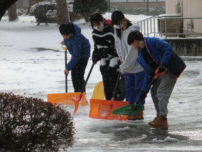 今季最強・最長寒波の影響で毎日のように雪が降り校舎前にたっぷりと雪が積もっています。毎日の雪かきに疲れていたところ、強力な助っ人が登場しました。雪かきボランティアの子どもたちです。誰にお願いされたわけでもなく、職員が雪かきをしていると手伝ってくれました。低学年から高学年まで優しい子どもたちに囲まれて幸せな気持ちになりました。子どもたちの心が育っていることを実感した一日でした。