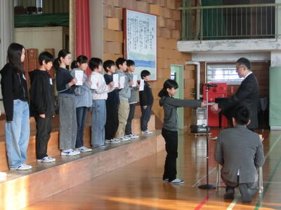 令和8年度の児童会役員を認証しました。4年生5年生の中から14名が児童会の代表として選出されました。認証式では、どの子も緊張した面持ちながらも何かを決意したような頼もしい表情をしていました。来年の児童会活動が活発に行われることを期待します。