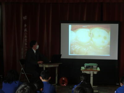 3年生が学校歯科医の先生より歯科指導を受けました。むし歯予防に大切なことをたくさん教えていただきました。ほんのちょっとの歯垢の中に1億のむし歯菌がいることを聞いて子どもたちは驚いていました。むし歯予防のハミガキの仕方も教えていただきましたので、しっかりとハミガキをしてむし歯予防をしてほしいと思います。歯科医の先生から小学生は治療が無料なので小さいうちにしっかりと治療と予防をしてほしいということを教えていただきました。この場をお借りしてお伝えいたします。