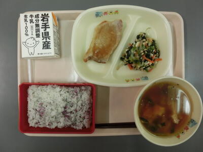 今日の給食の献立は、6年1組4班が考えた「いろどり給食」でした。おすすめのポイントは、いろどりを考えて旬の野菜を使ったこととのことでした。みんなが好きなお肉を生姜焼きとして入れ、五大栄養素を考えてつくった献立とても美味しかったです。家庭科の学習が生きた献立でした。
