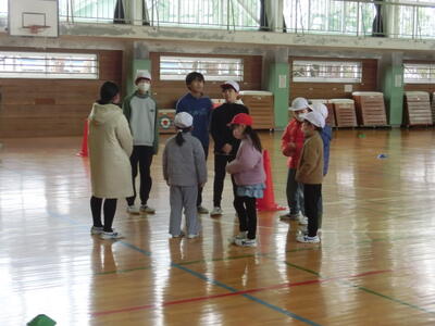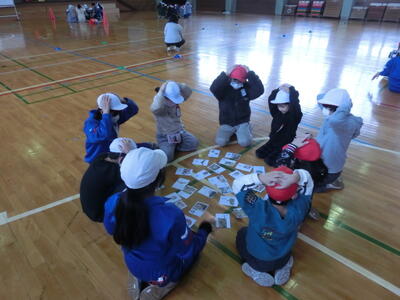 1年生と6年生の交流する会が開かれました。前半は、6年生が1年生と一緒に鬼ごっこを楽しみ、後半は、1年生が国語の学習で作った「動物の赤ちゃんかるた」をして楽しみました。1年生が作ったかるたで遊んでいるときには、6年生がとった札を譲る優しさも垣間見え、とても温かい交流会に見えました。